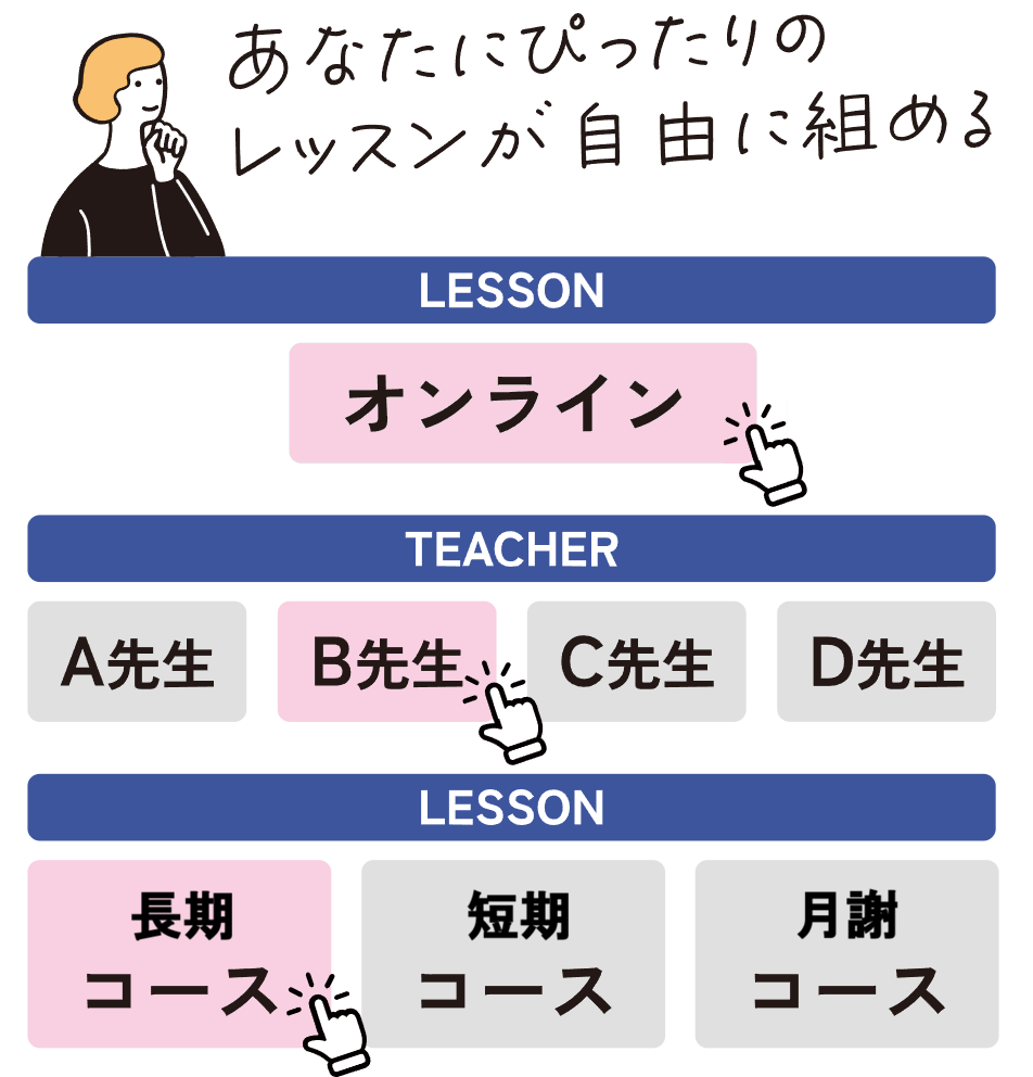 ご自身の学習計画にあわせて、都度の都合に合わせてレッスン調整が可能なプラン、若しくは毎月決まったレッスン数のみを受講する月謝プランが選べます。レッスンは全てオンラインで受講頂きます。ご自身の学習ペースを維持しながら、最適な料金で中国語を学べるプランが充実しています。